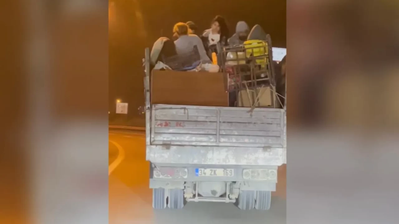 Olay, saat 23.00 sıralarında Şile Otoyolu'nda yaşandı. Seyir halindeki kamyonette taşınan eşyaların üzerinde 5 kişi yolculuk yaptı. Trafikteki tehlikeli yolculuk cep telefonu kamerasıyla kaydedildi. Görüntülerde eşyaların üzerinde oturan iki çocuk ve diğerlerinin hiçbir güvenlik önlemi olmadan yolculuk yaptığı anlar yer alıyor.