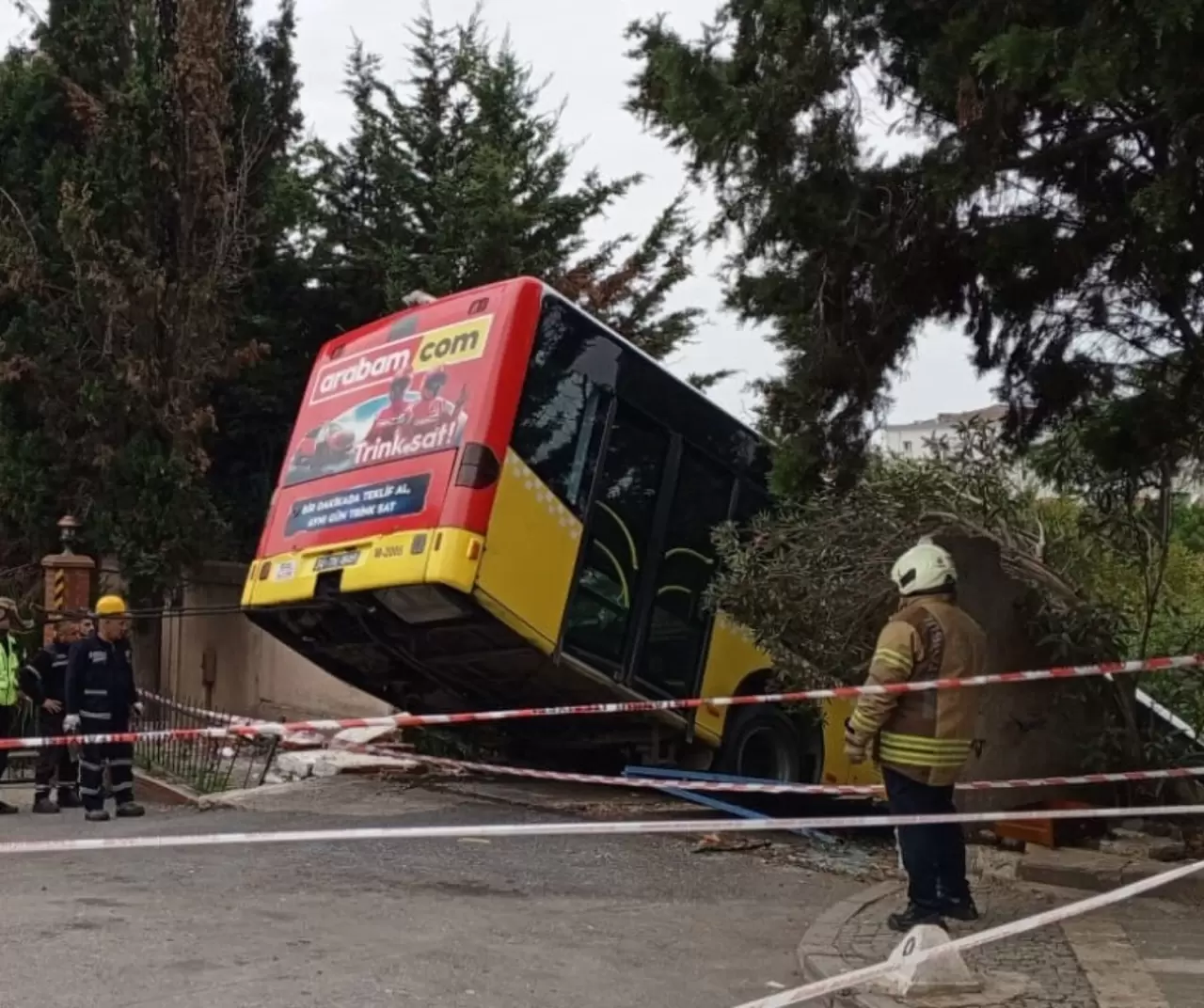 Üsküdar Barbaros Mahallesi’nde park halindeki İETT otobüsü, el freninin çekilmemesi nedeniyle hareket ederek bir sitenin istinat duvarına çarptı ve asılı kaldı.