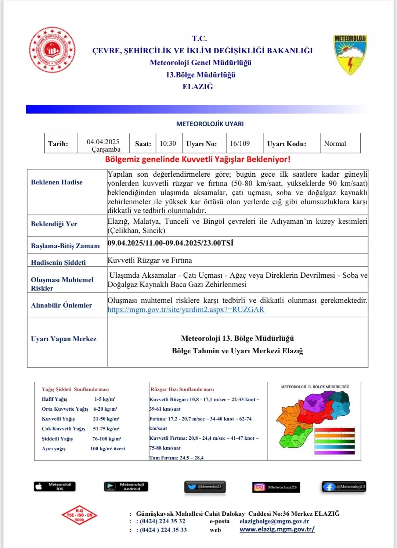 Yağışların; Muğla, Denizli, Afyonkarahisar, Burdur, Isparta, Muş, Bitlis, Ağrı, Siirt, Şırnak ve Hakkari çevreleri ile Antalya'nın batı, Van'ın güney kesimlerinde yer yer kuvvetli olacağı tahmin ediliyor. Doğu Anadolu'nun güneydoğusu ile ve Güneydoğu Anadolu'da toz taşınımı bekleniyor.