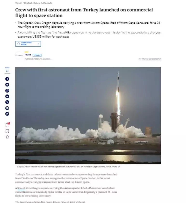 Birleşik Arap Emirlikleri merkezli El Arabiya, 'SpaceX, Türkiye'den ilk astronotu Uluslararası Uzay İstasyonu'na fırlattı' başlığıyla okurlarının karşısına çıktı.
