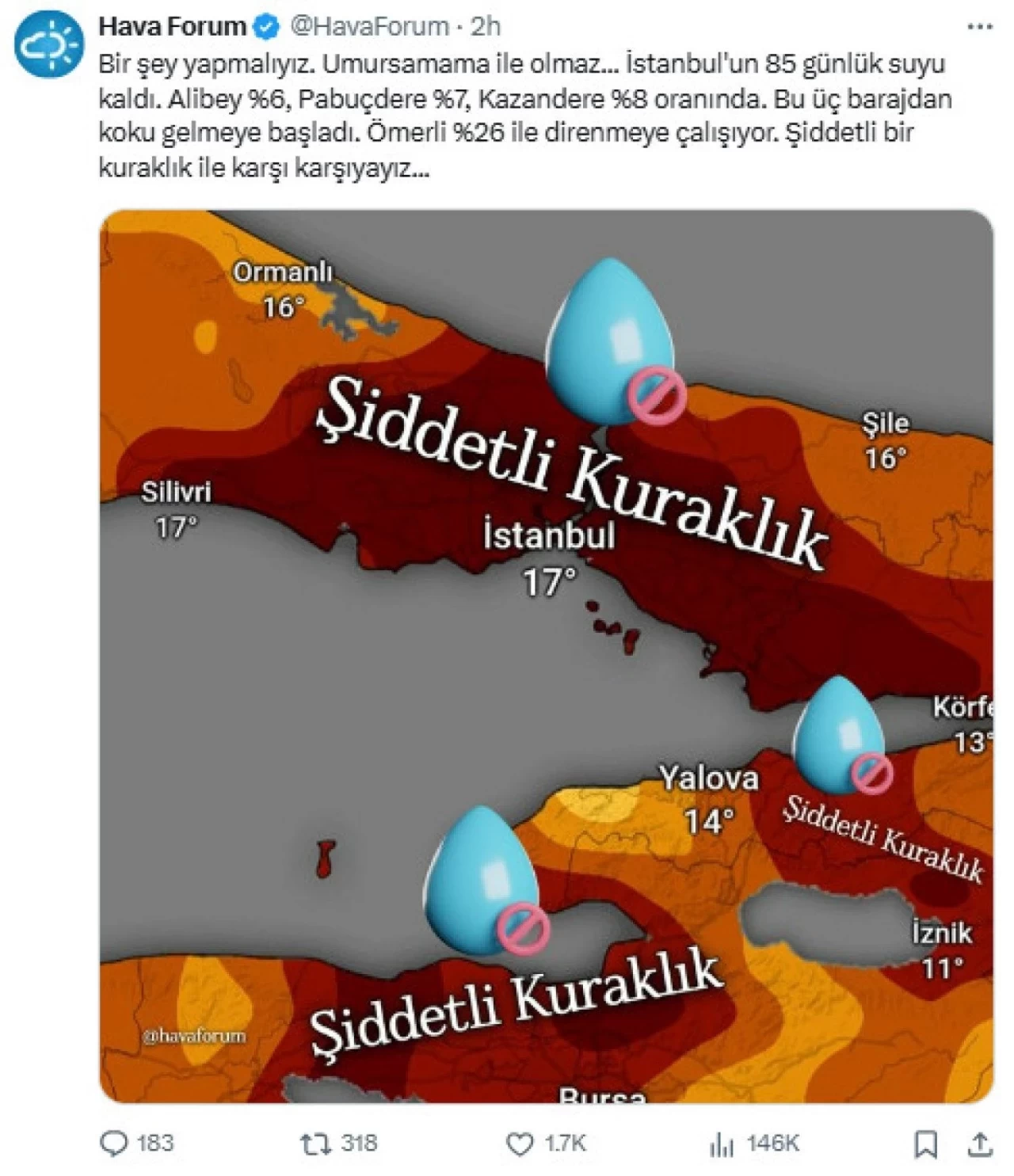 Meteoroloji kaynağı Hava Forum, X hesabından yaptığı açıklamada İstanbul'daki barajların azaldığına dikkat çekti.
