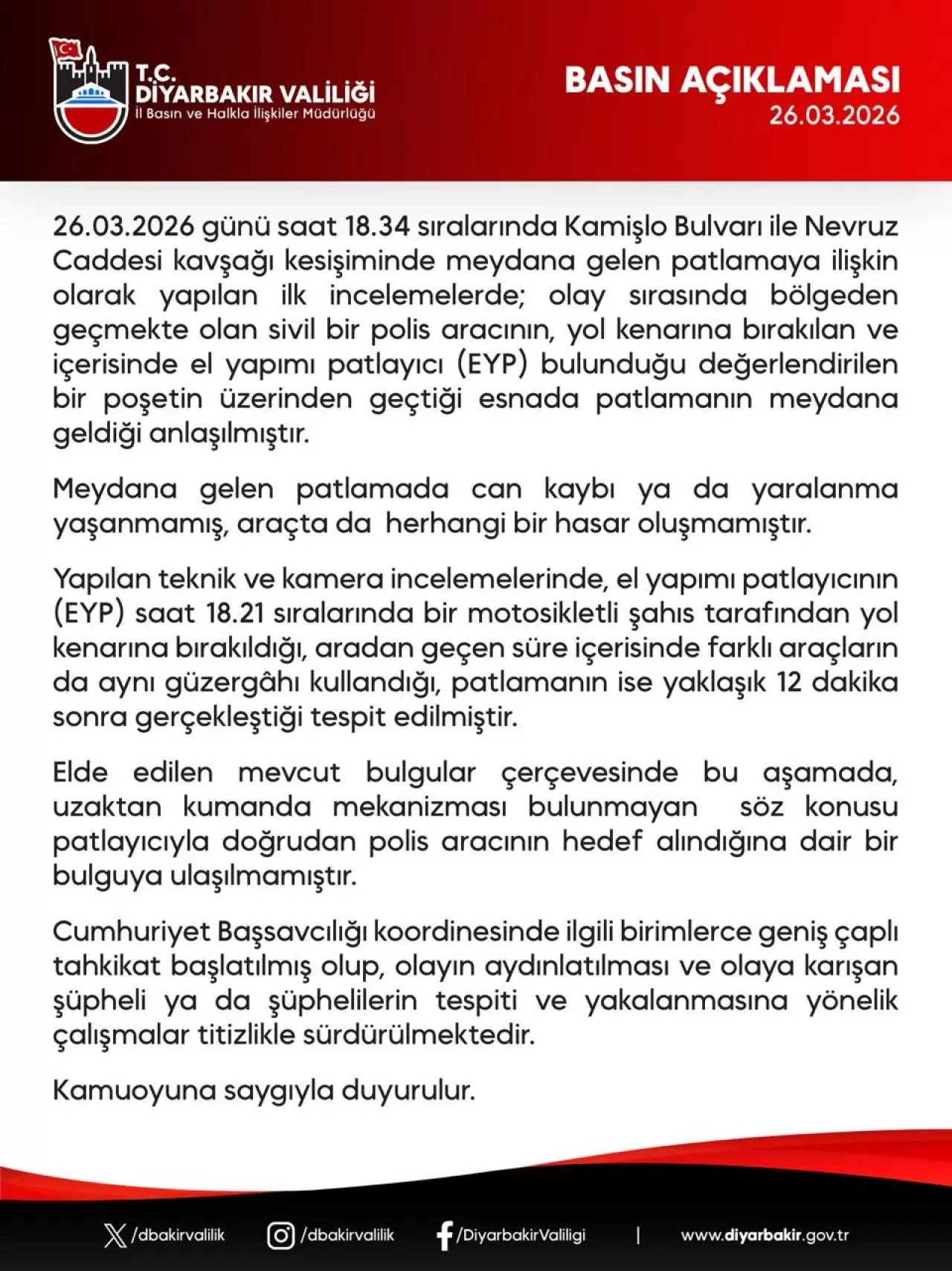 Diyarbakır Valiliği'nden yapılan açıklamada, ''26 Mart saat 18.34 sıralarında Kamişlo Bulvarı ile Nevruz Caddesi kavşağı kesişiminde meydana gelen patlamaya ilişkin olarak yapılan ilk incelemelerde olay sırasında bölgeden geçmekte olan sivil bir polis aracının, yol kenarına bırakılan ve içerisinde el yapımı patlayıcı (EYP) bulunduğu değerlendirilen bir poşetin üzerinden geçtiği esnada patlamanın meydana geldiği anlaşılmıştır. Meydana gelen patlamada can kaybı ya da yaralanma yaşanmamış, araçta da herhangi bir hasar oluşmamıştır. Yapılan teknik ve kamera incelemelerinde, el yapımı patlayıcının (EYP) saat 18.21 sıralarında bir motosikletli şahıs tarafından yol kenarına bırakıldığı, aradan geçen süre içerisinde farklı araçların da aynı güzergahı kullandığı, patlamanın ise yaklaşık 12 dakika sonra gerçekleştiği tespit edilmiştir. Elde edilen mevcut bulgular çerçevesinde bu aşamada, uzaktan kumanda mekanizması bulunmayan söz konusu patlayıcıyla doğrudan polis aracının hedef alındığına dair bir bulguya ulaşılmamıştır. Cumhuriyet Başsavcılığı koordinesinde ilgili birimlerce geniş çaplı tahkikat başlatılmış olup, olayın aydınlatılması ve olaya karışan şüpheli ya da şüphelilerin tespiti ve yakalanmasına yönelik çalışmalar titizlikle sürdürülmektedir'' denildi.