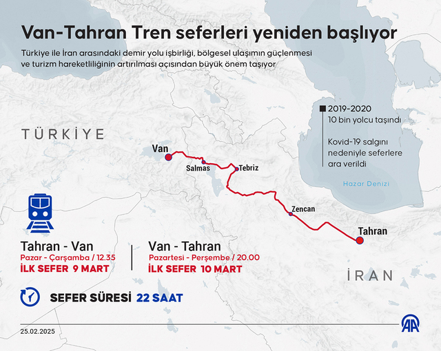 Van ile Tahran arasında büyük ilgi gören tren seferleri 9 Mart 2025’te Tahran’dan, 10 Mart 2025’te ise Van’dan başlayacak.