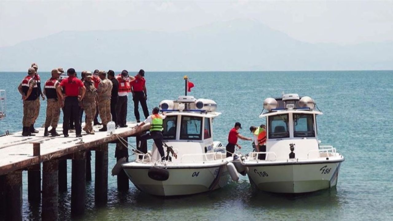 Van Gölü yüzeyinde Jandarma, JAK, Emniyet Müdürlüğü, AFAD, UMKE ve sağlık ekipleri çalışma yürütüyor.