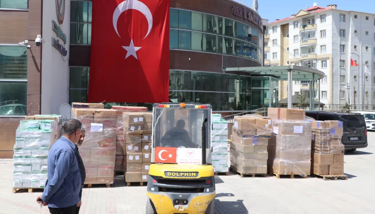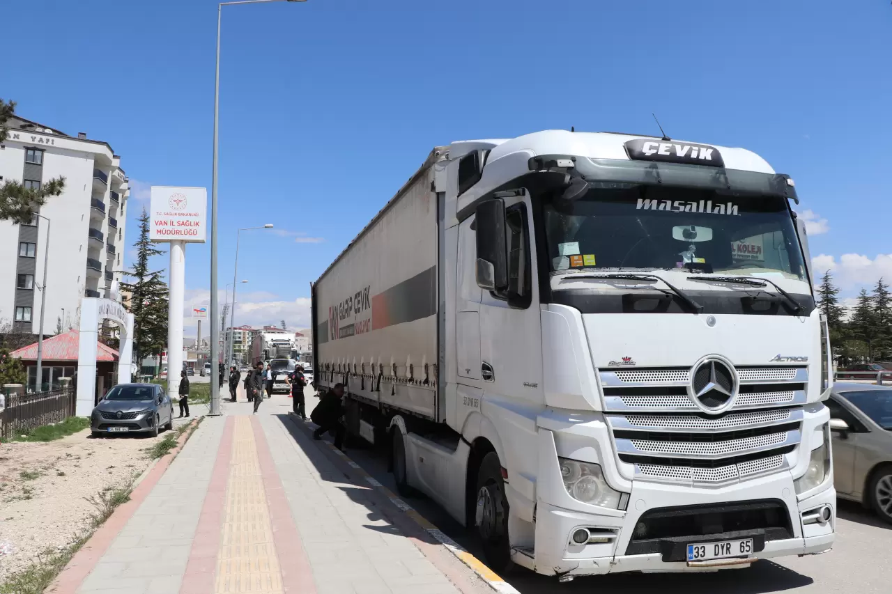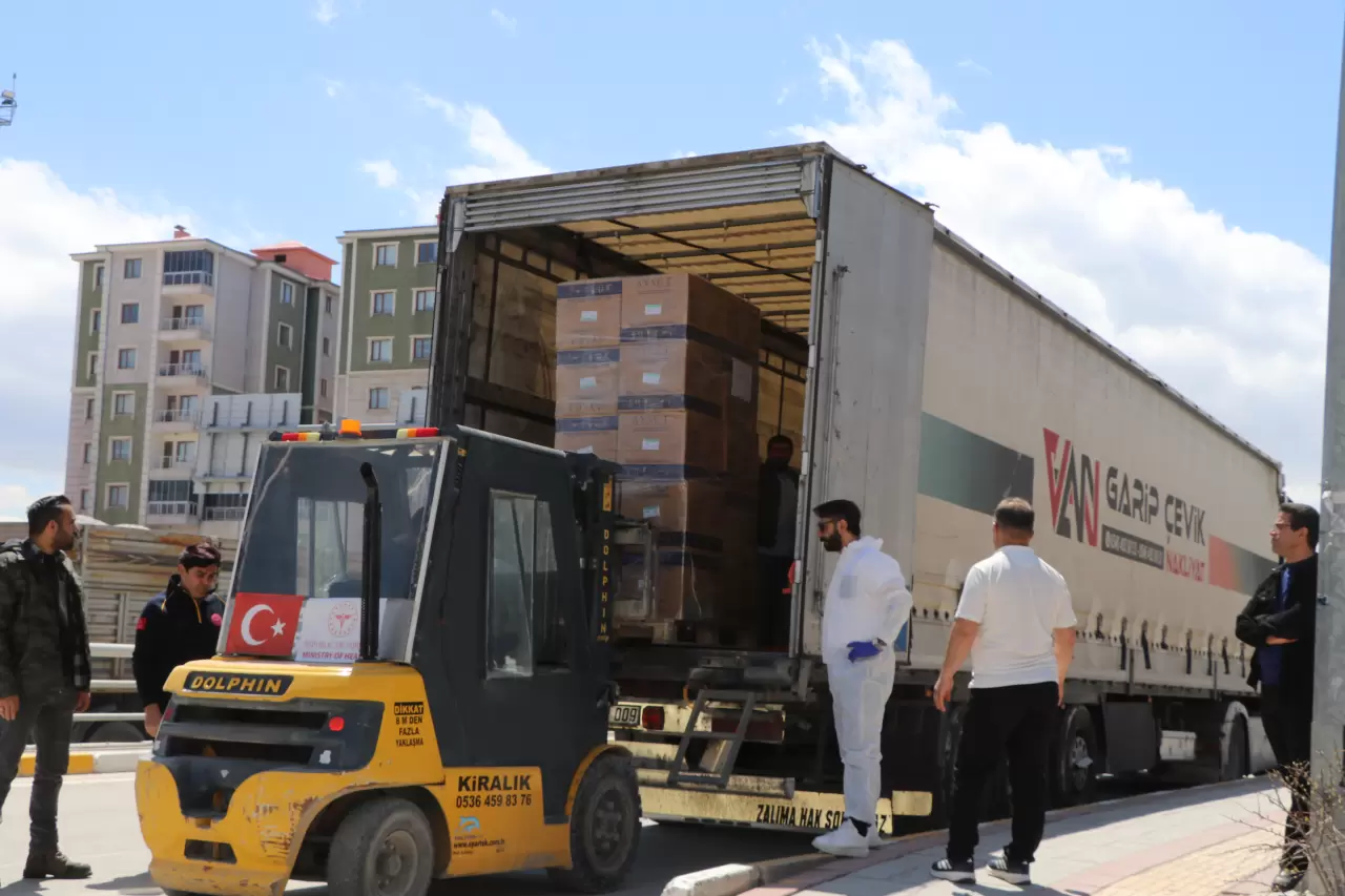 Van İl Sağlık Müdürlüğü koordinesinde hazırlanan tıbbi sarf malzemeleri, ilaç, serum, cihaz, oksijen tüpleri ve sedyeler kolilere konularak TIR’lara yüklendi. Yardım malzemelerini taşıyan 6 TIR, Ağrı’nın Doğubayazıt ilçesindeki Gürbulak Sınır Kapısı üzerinden İran’a gitmek üzere yola çıktı.