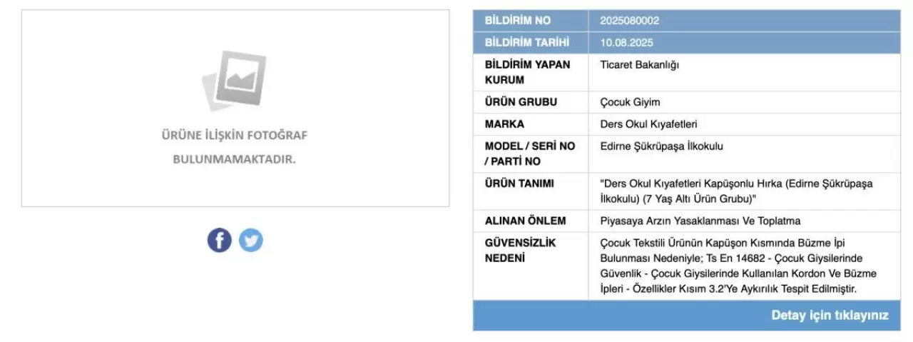 Toplatılan ürün, özellikle 7 yaş altı çocuklar için tasarlanmış kapüşonlu hırka modeli olarak belirtiliyor.