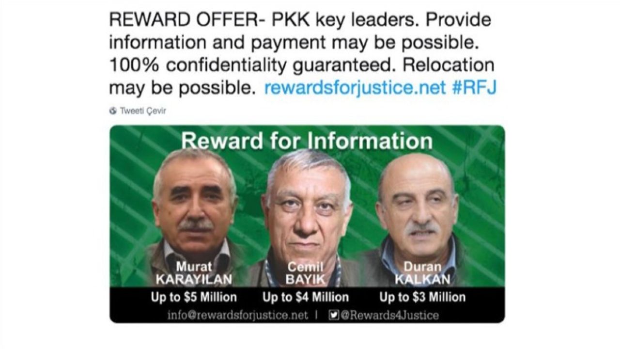 Mesajda fotoğrafları yer alan Karayılan için 5 milyon dolar, Bayık için 4 milyon dolar, Kalkan için 3 milyon dolara kadar ödül verilebileceği hatırlatılmıştı.