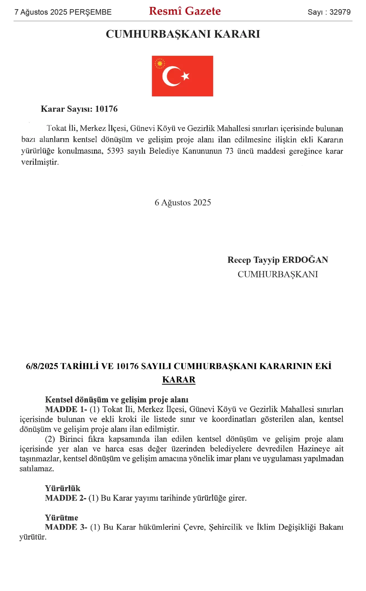 Tokat’ta kentsel dönüşüm çalışmaları hız kesmeden devam ediyor. Yazıcıoğlu bölgesinde 32.3 hektarlık alan, 6 Ağustos 2025 tarihinde Cumhurbaşkanı Recep Tayyip Erdoğan’ın imzasıyla “kentsel dönüşüm ve gelişim alanı” ilan edildi. Karar, 7 Ağustos 2025 tarihli Resmî Gazete’de yayımlanarak yürürlüğe girdi.