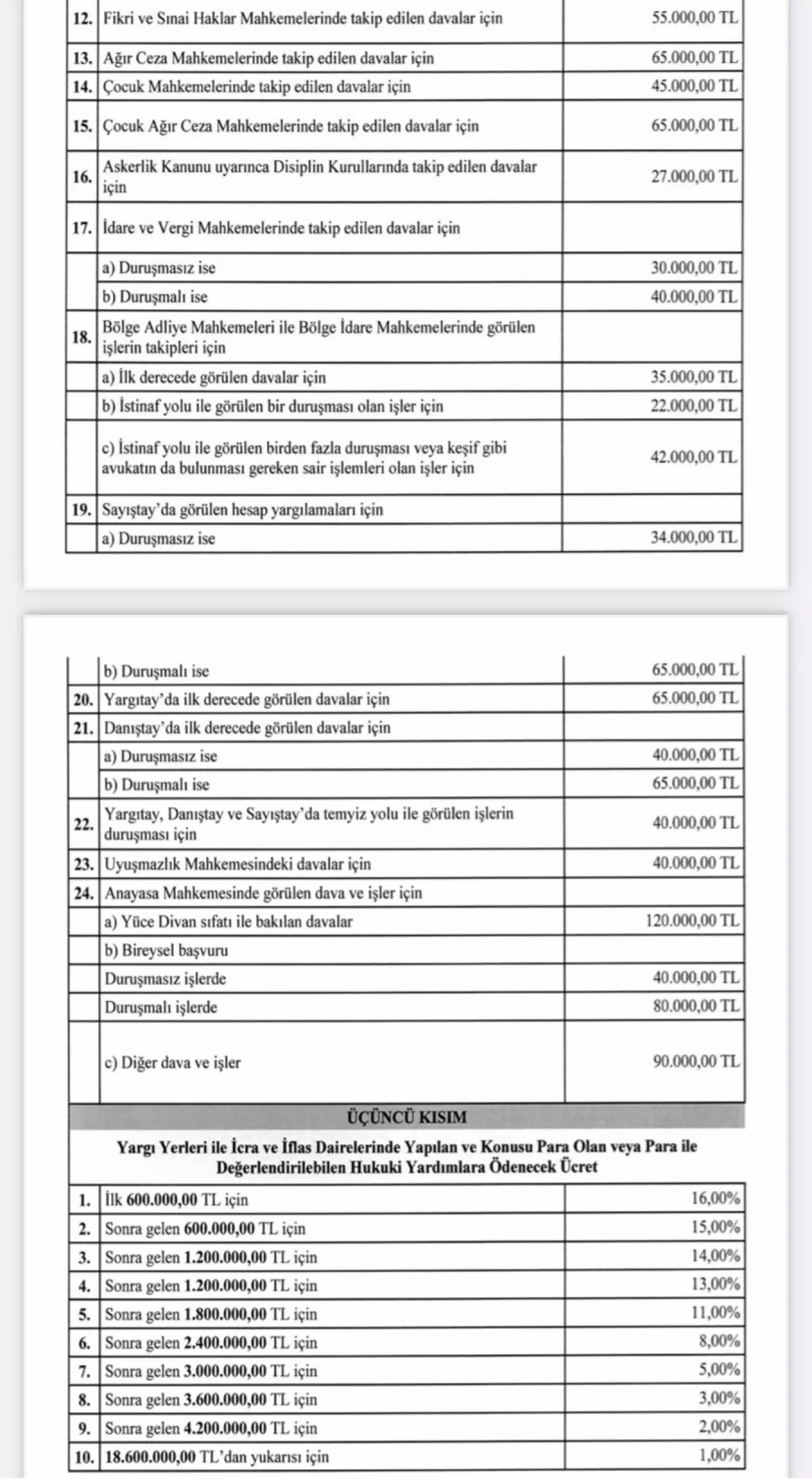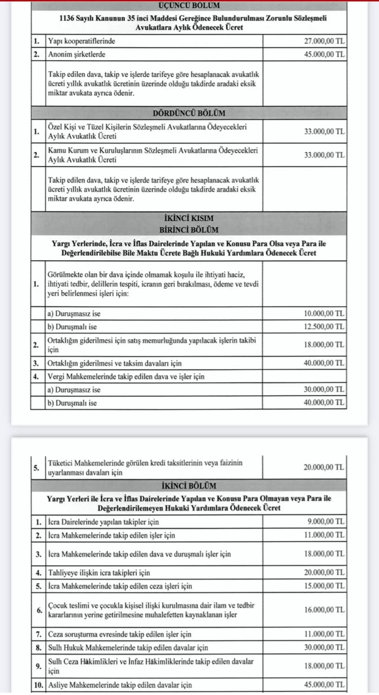 Ayrıca anonim şirketlerde bulundurulması zorunlu sözleşmeli avukatların alacağı ücret 45 bin TL’ye, yapı kooperatiflerindekilerin ise 27 bin TL’ye çıkarıldı.