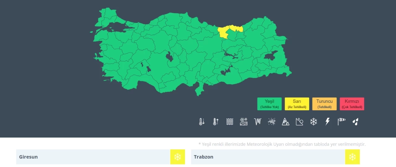 Meteoroloji Genel Müdürlüğü, Giresun ve Trabzon için sarı kodla kar uyarısında bulundu.