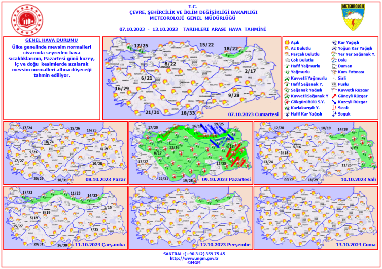 Çarşamba günü Yurdun kuzey kesimlerinin parçalı ve yer yer çok bulutlu, güney kesimlerinin az bulutlu ve açık, Karadeniz Bölgesi'nin kıyı kesimlerinin yağışlı geçmesi bekleniyor. Perşembe günü Doğu Karadeniz'in kıyı kesimlerinde yağış görülürken, kalan bölgeler parçalı ve az bulutlu geçecek. Cuma günü ise yurt genelinde yağış beklenmiyor.