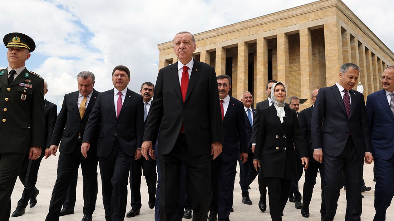 Kabine üyeleriyle birlikte Aslanlı Yol'dan yürüyerek Atatürk'ün mozolesine çıkan Erdoğan'ın, ay yıldızlı çelengi bırakmasının ardından saygı duruşunda bulunuldu ve İstiklal Marşı okundu.