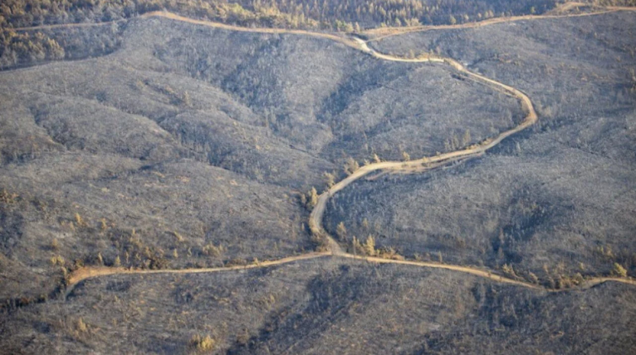 Yeşil alanların siyaha döndüğü yangın bölgesi görüntülere yansıdı.