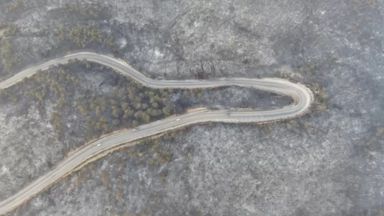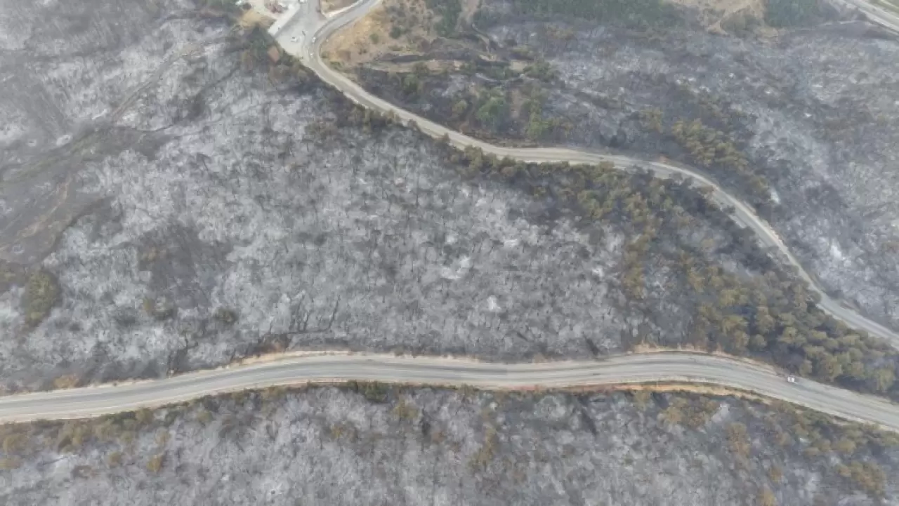 İğdir ve Narlıdere köylerinde kaydedilen dron görüntüleri çamla bezeli ormanlık alandan geriye tüten görüntü ve griye dönüşmüş çam ağaçları kaldı.