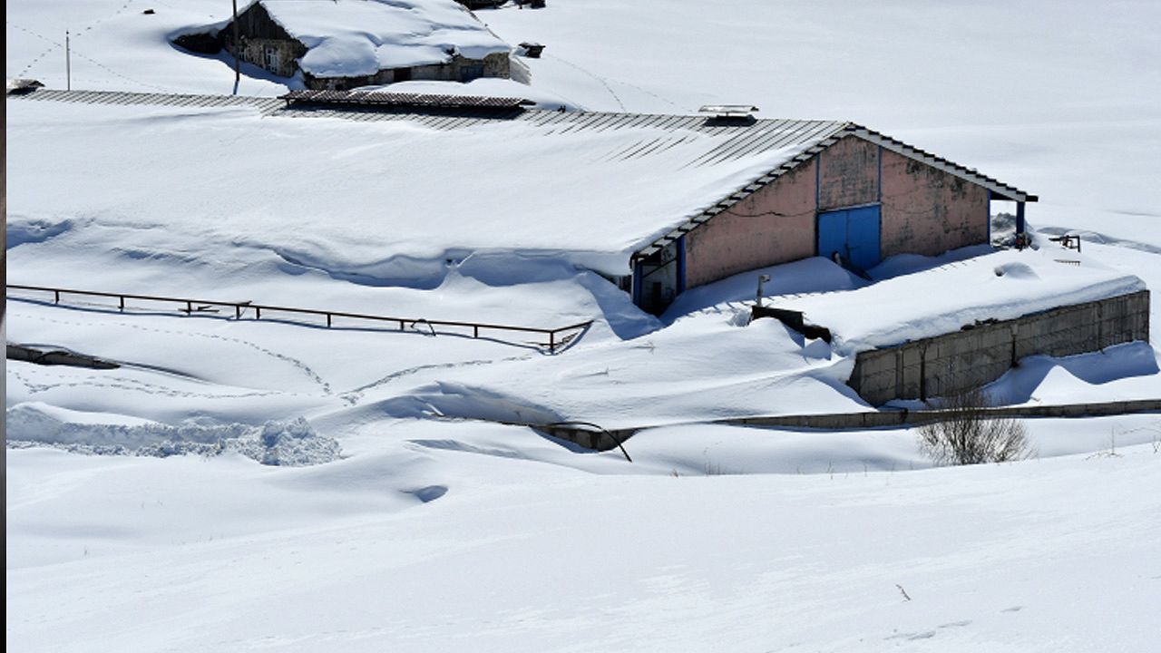 Ülke genelinde ilkbahar mevsiminin yaşandığı bugünlerde Doğu Anadolu Bölgesi'nde yer alan bu köydeki evler, ahırlar ve araçlar, geçen haftalarda etkili olan yağışla kar altında kaldı.