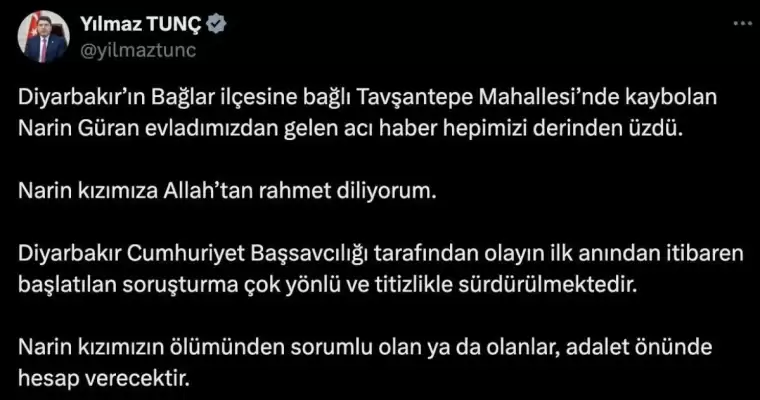 Narin'in cansız bedeninin bulunmasının ardından Adalet Bakanı Yılmaz Tunç, X hesabından açıklamalarda bulundu.