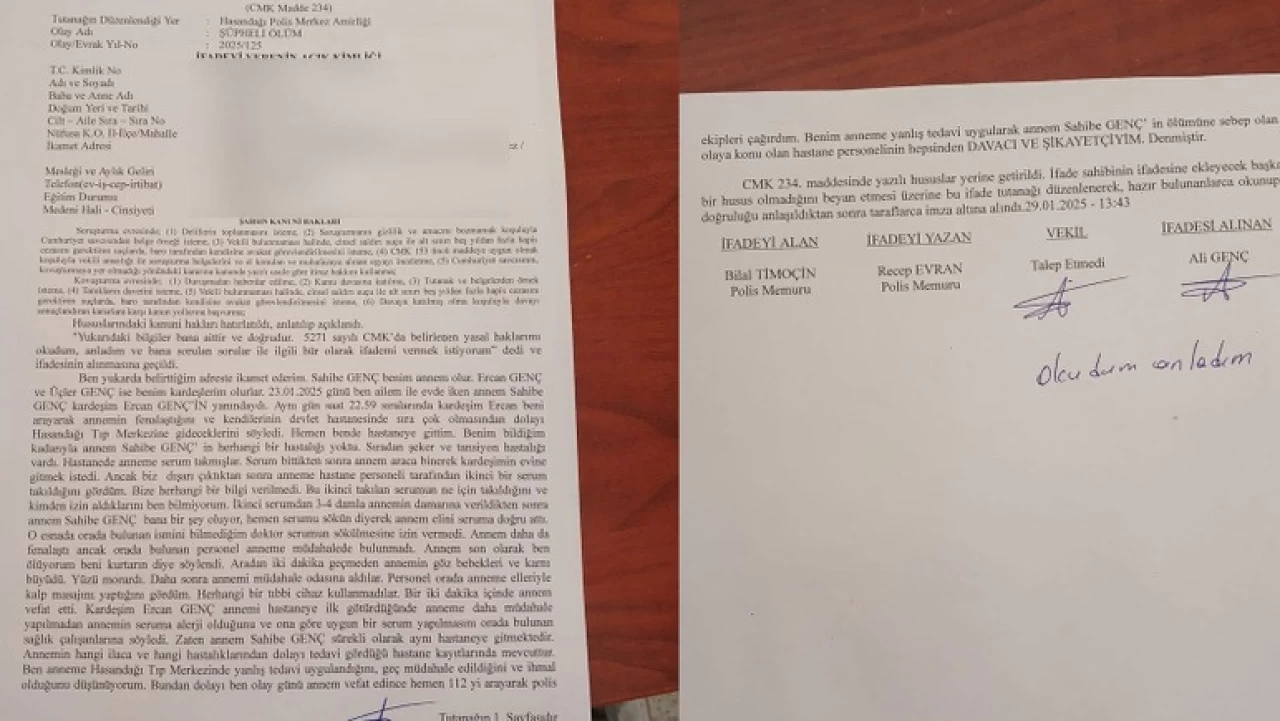 Oğlu Ali Genç olay gününü anlatarak “23 Ocak Perşembe akşamı yemeğimizi yedik çayımızı içtik. Annemin gribal enfeksiyonu dışında bir şeyi yoktu. Öksürük ya da yemek yeme şikayeti bile yoktu. Annem daha sonrasında abime kendisini hastaneye götürmesini istedi. Abim de devlet hastanesi yoğun olduğu için tıp merkezine götürdü. Annemin de bazı ilaçlara alerjsi var. Abim hastane personeline diyor ki; “Annemin soğuk algınlığı var ancak bazı ilaçlara da alerjisi var” diye belirtiyor. Onlar da “tamam” diyor. 1.serum yapılıyor. Annem taburcu olmak istiyor. Oradaki doktor anneme “olmaz bir serum daha vereceğiz” diyor. 2. serum yaptıktan sonra 3 damla gidince annem fenalaşıyor. “Ölüyorum, kurtarın” diye bağırıyor. Bizden hiçbir şekilde imza izin belgesi alınmadı. 2. Serumu sırf parasını almak için yaptılar. Annem fenalaşınca abim serumu kapatmalarını istiyor, oradakiler de panik oluyor. Annem orada 5 dakika içinde vefat ediyor. Hastanede şok cihazı ile müdahale edilemiyor. Çünkü şok cihazı yok.” İfadelerini kullandı.