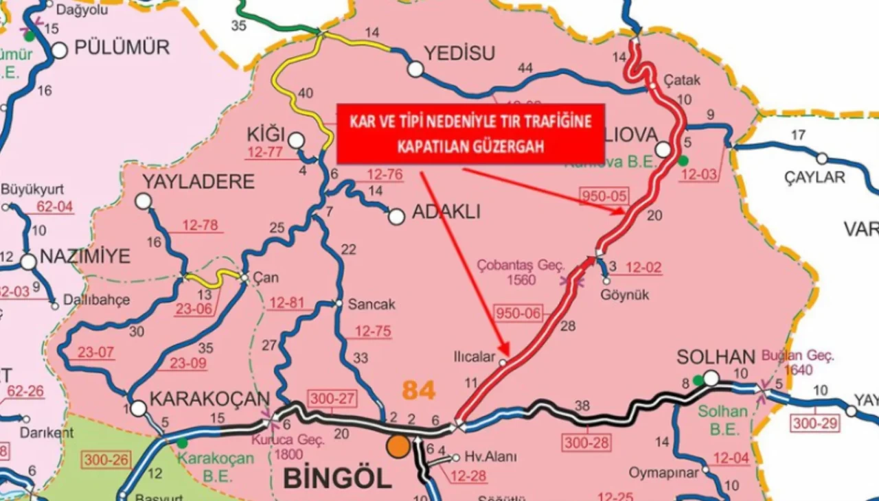 Açıklamada, Bingöl–Erzurum Devlet Yolu’nun 0 ile 88’inci kilometreleri arasında kalan Kervansaray Kavşağı ile Bingöl–Erzurum il sınırı arasındaki kesimin, saat 16.50 itibarıyla TIR geçişlerine kapatıldığı belirtildi.