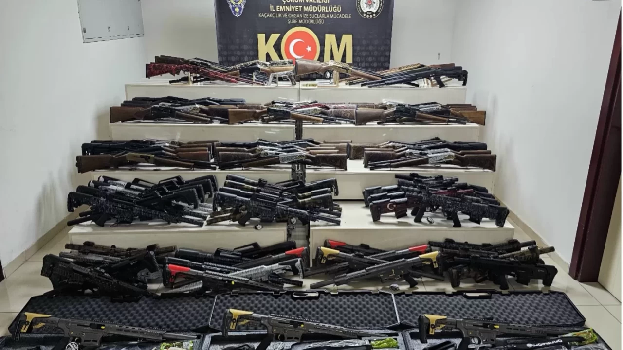 Çorum'da yol kontrol noktasında durdurulan hafif ticari araçta 118 ruhsatsız av tüfeği ele geçirildi.