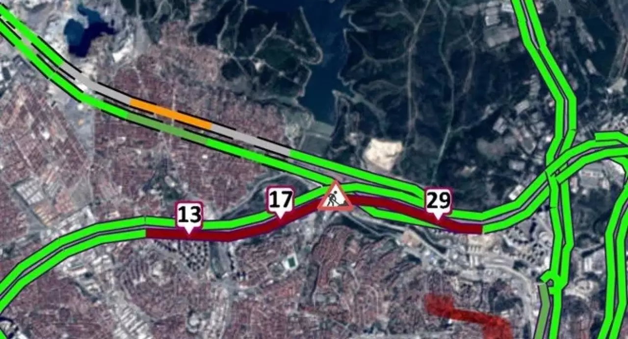 İstanbul TEM Otoyolu'nda Gaziosmanpaşa mevkisinden Ankara yönüne doğru Akşemsettin Viyadüğü'ndeki yol çalışması nedeniyle ulaşım tek şeritten sağlanıyor.