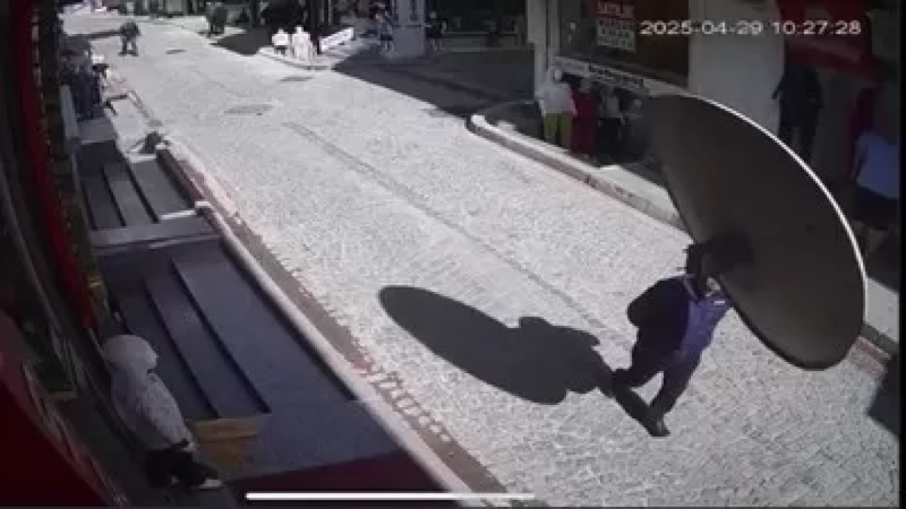 Görüntülerde, şahsın yolda yürüdüğü esnada yukarıdan düşen çanak antenin omzuna çarparak yere düştüğü anlar yer alıyor.