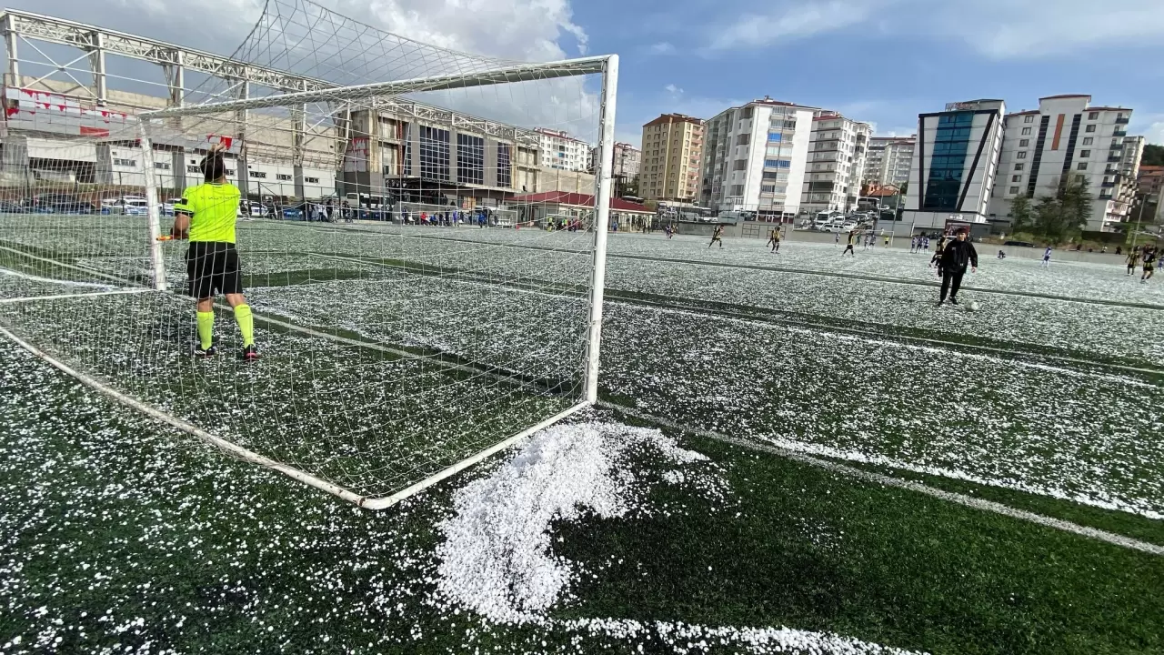 Bölgesel Amatör Lig müsabakasında karşılaşan Sorgun Belediyespor ve Sarıkaya Belediyespor maçının devre arasına denk gelen dolu yağışı sonrası stat temizlendi.