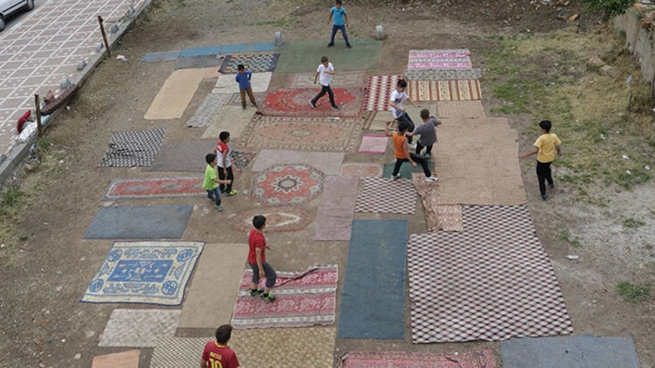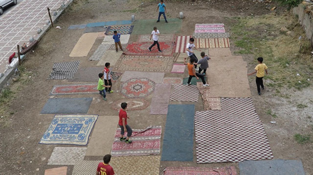 Taşlardan kale direkleri yapan çocuklar, zemini sert arsada düşüp yararlanmamak için etraftan topladıkları ve evden getirdikleri eski halı ve kilimleri sererek kendilerine "halı saha" yaptı.