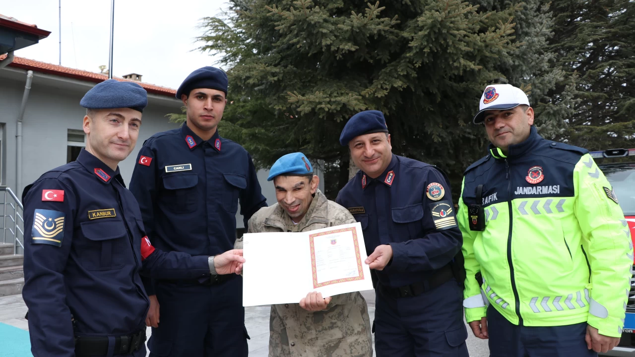 Terhis belgesini İl Jandarma Komutanı Albay Cezmi Yalınkılıç'tan alan Ak, hatıra fotoğrafı çektirdi.
