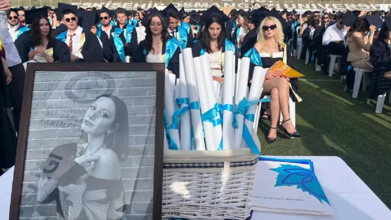 Ancak tören, 6 Şubat depremlerinde Kahramanmaraş’ta enkaz altında kalarak hayatını kaybeden 21 yaşındaki Begüm Sarıyıldız’ın anılmasıyla derin bir anlam kazandı. Öğrenciler, sınıf arkadaşlarını unutmayarak, Begüm’ün fotoğrafını diplomalarının önüne yerleştirdi.
