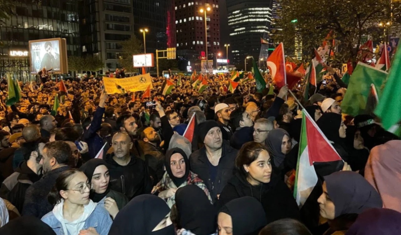 Hastanenin bombalanmasına tepki gösteren katılımcılar, "Katil İsrail Filistin'den defol" sloganları atarken zaman zaman tekbir de getirdi.