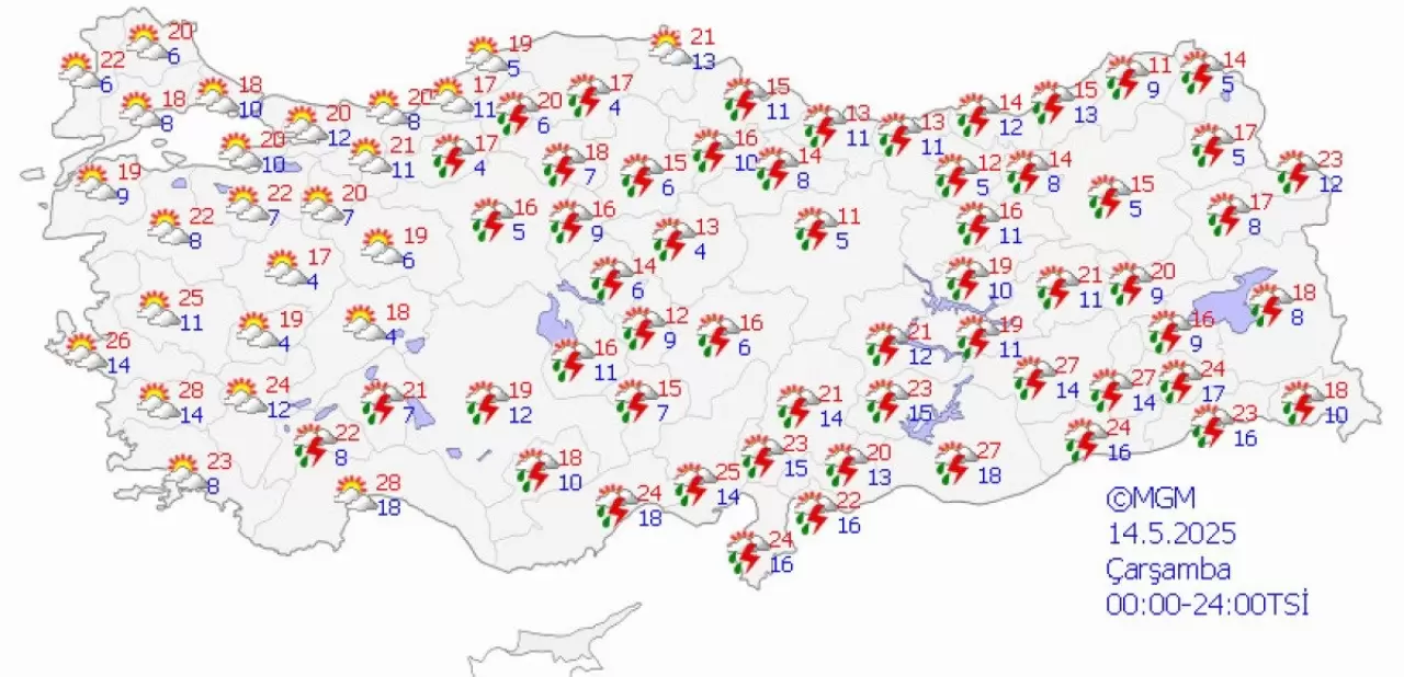 Son olarak 14 Mayıs Çarşamba günü, doğu bölgelerdeki yağışlar hafifleyecek, batı ve iç kesimlerde güneşli hava devam edecek, sıcaklıklar ise 5-27 derece arasında değişecek.