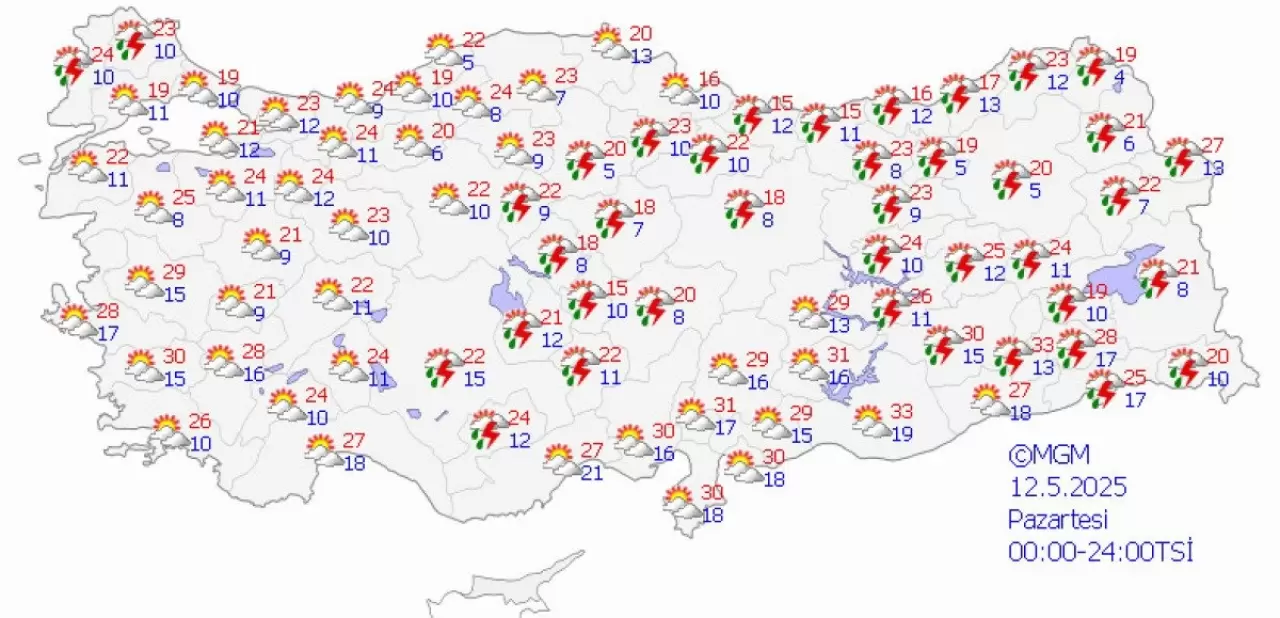 12 Mayıs Pazartesi günü, batı bölgelerde güneşli hava hakim olurken, sıcaklıklar 8-33 derece arasında ölçülecek.