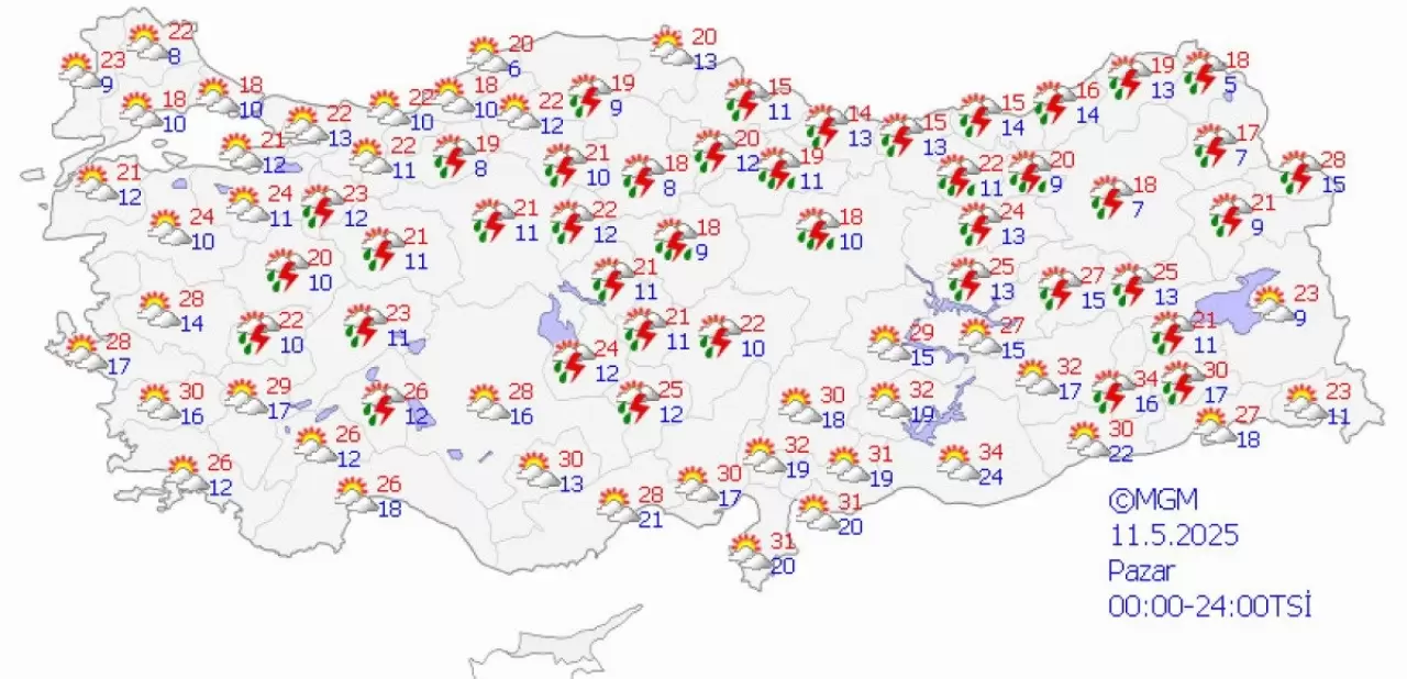 11 Mayıs Pazar günü, yağışlar İç Anadolu, Karadeniz ve Doğu Anadolu'da yoğunlaşacak, sıcaklıklar 9-34 derece aralığında seyredecek.
