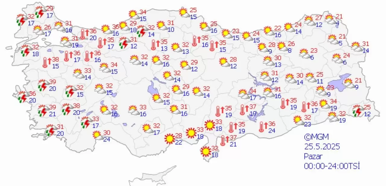 25 Mayıs Pazar günü, doğudaki yağışlar hafiflerken, batıda güneşli hava etkili olacak; sıcaklıklar 12-37 derece arasında seyredecek.