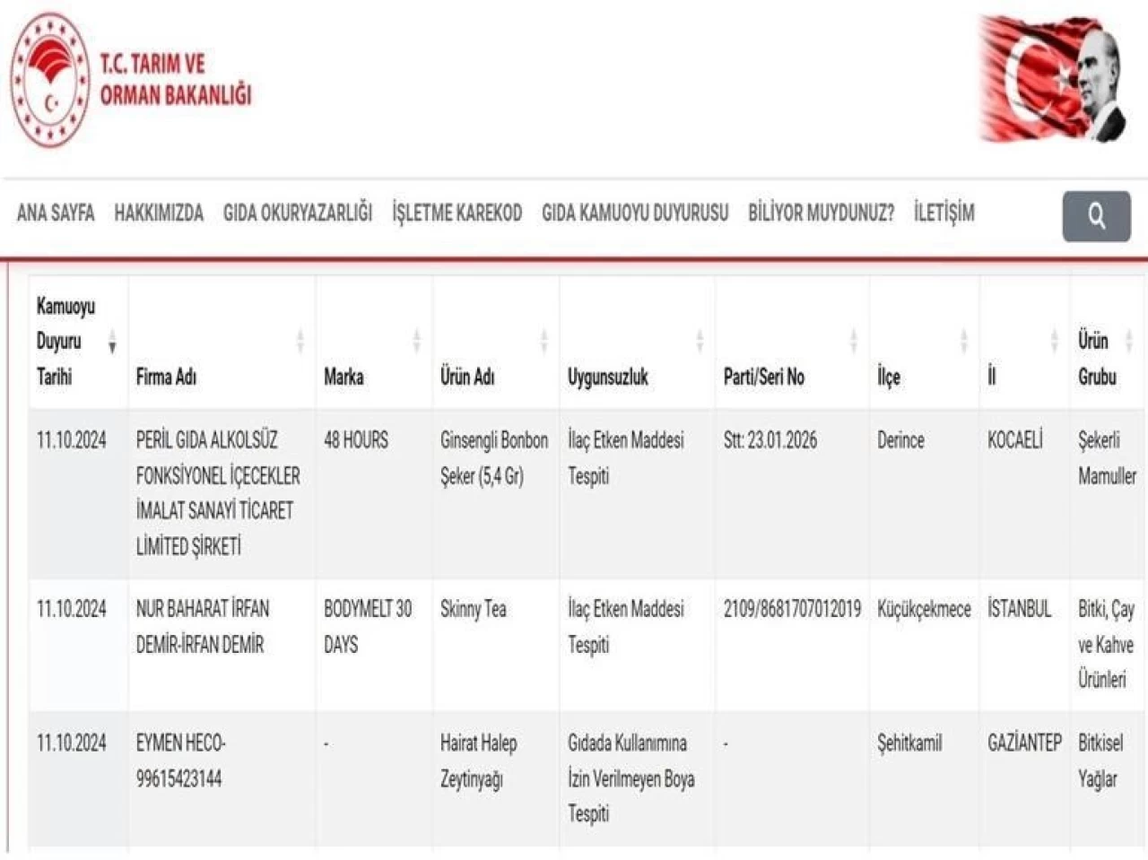 Sitede 'Sağlığı Tehlikeye Düşürecek Gıdalar' bölümünde; merkezi Gaziantep'in Şehitkamil ilçesinde bulunan 'Eymen Heco' firmasının 'Hairat Halep Zeytinyağı' ürününde gıdada kullanımına izin verilmeyen boya tespit edildiği belirtildi. Yine Kocaeli'nin Derince ilçesindeki 'Peril Gıda Alkolsüz Fonksiyonel İçecekler' şirketinin glisengli bonbon şeker ürününde ve İstanbul'un Küçükçekmece ilçesindeki 'Nur Baharat' firmasının ürettiği poşet çayda ilaç etken maddesi tespit edildiği belirtildi.