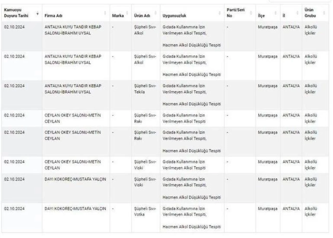 Sağlığı Tehlikeye Düşürecek Gıdalar' listesinde dikkat çeken bir tespit de Antalya'dan geldi. Yapılan denetimde bulunan bir kuyu tandır kebap salonundaki ürünün içinde tekila tespit edildi. Yine Antalya'da bulunan bir kokoreççinin ürününde ise votka tespit edilirken aynı kokoreççiden alınan bir numunede de viski tespit edildi. Öte yandan yine Antalya'da faaliyet gösteren bir okey salonundaki gıdalarda ise viski, rakı tespit edildi.