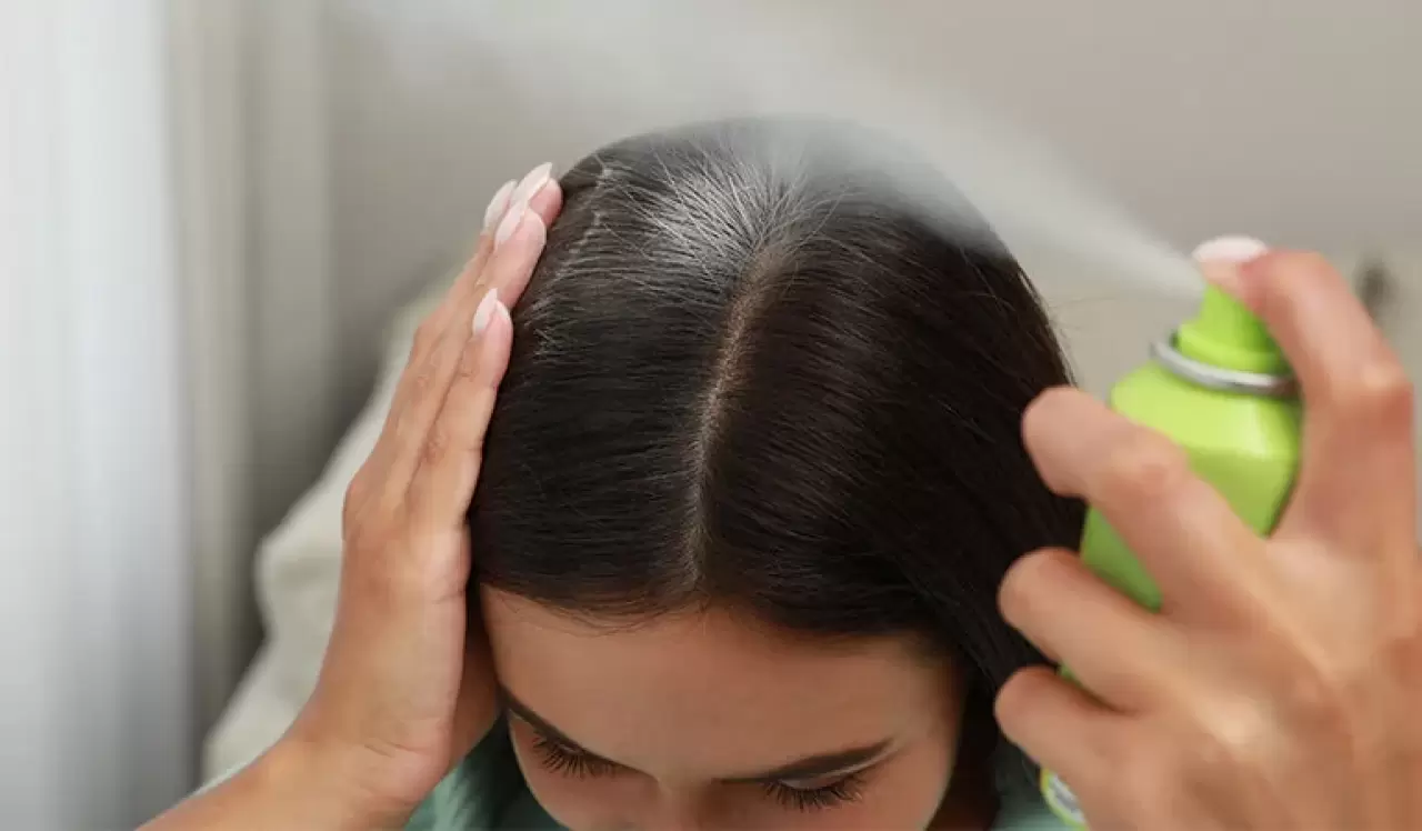 - Şampuan sprey formdaysa 15–20 cm mesafeden saç diplerine püskürtün. Toz halindeyse az miktarda saç köklerine serpin.