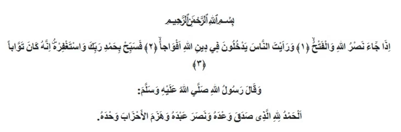 Hutbemi Nasr sûresinin mealiyle bitiriyorum: “Allah’ın yardımı ve fetih geldiğinde; insanların bölük bölük Allah’ın dinine girdiğini gördüğünde, Rabbine hamdederek O’nu tesbih et ve O’ndan bağışlanma dile. Şüphesiz O, tövbeleri çok kabul edendir.”[6]