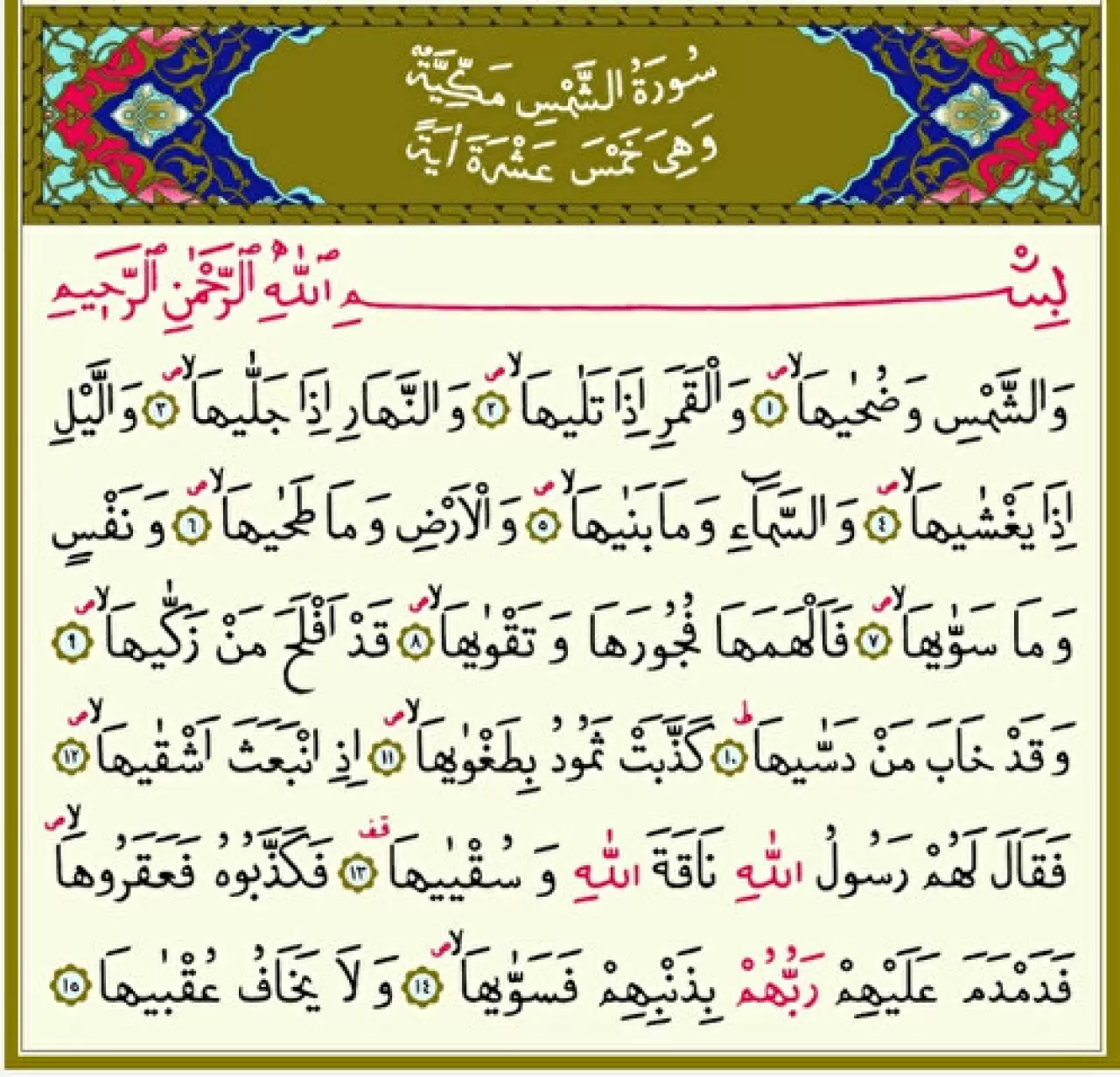 Surede, güneş, ay, gece, gündüz, gök, yer ve nefis gibi önemli varlık ve kavramlar üzerine yemin edilerek, insanın yaratılışında hem iyilik hem de kötülük eğilimlerinin bulunduğu vurgulanır. Nefsini arındıranların kurtuluşa ereceği, onu günaha sürükleyenlerin ise ziyana uğrayacağı bildirilir. Ayrıca Semûd kavminin peygamberlerine karşı gelmeleri sebebiyle helak edilişine değinilerek insanlara ibret verilir.