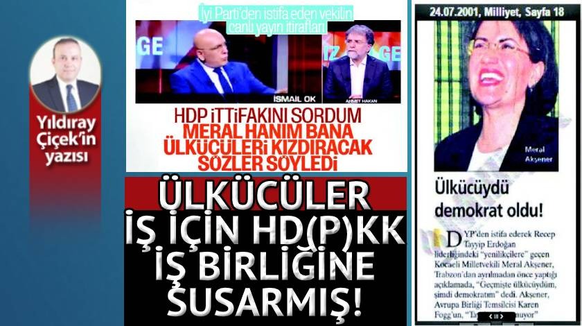 CHP’nin HD(P)KK ile olan ilişkisine ses etmeyen kendisi, CHP-HDP ittifakının yancısı olan kendisi ama “Ülkücüler belediyelerden iş almak için HDP ile iş birliğine ses çıkarmazlar” diyerek aşağıladığı Ülkücüler… Meral Akşener bilmese de, HDP sayesinde gelecek ekmeği Ülkücüler haram bilir! MHP’yi milletvekili ve belediye başkanı olamamaktan dolayı yahut tekrar bunları olmak adına satanların kurduğu bu partiden böyle garabetler elbette beklenir. Biraz şerefi, haysiyeti olanlar zaten bunlara dayanamayıp bir bir istifa ediyor.