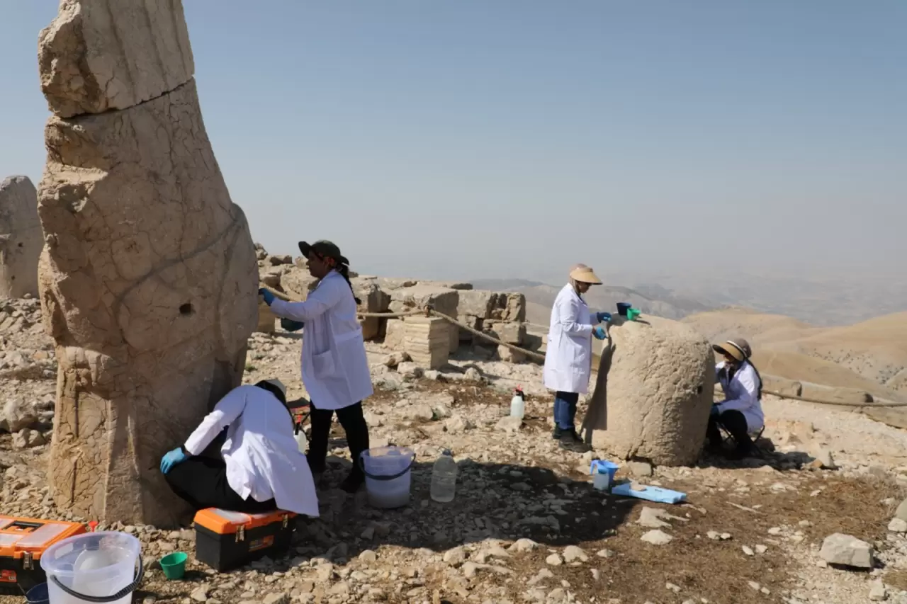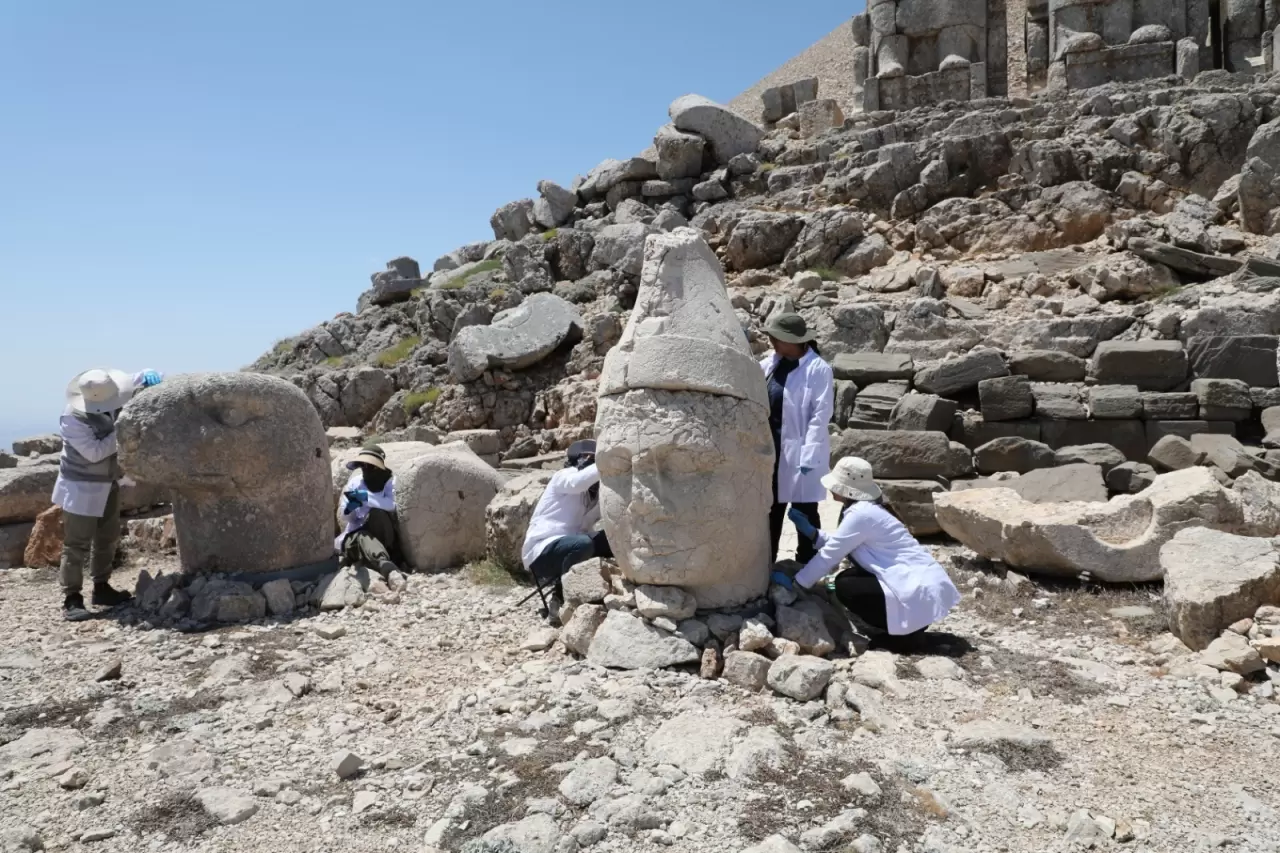 İlk kez uygulanan yeni yöntem dev taşlara nefes oluyor. Nemrut Dağı’nın Doğu ve Batı teraslarında yer alan eserler nano teknolojiyle koruma altına alınıyor.