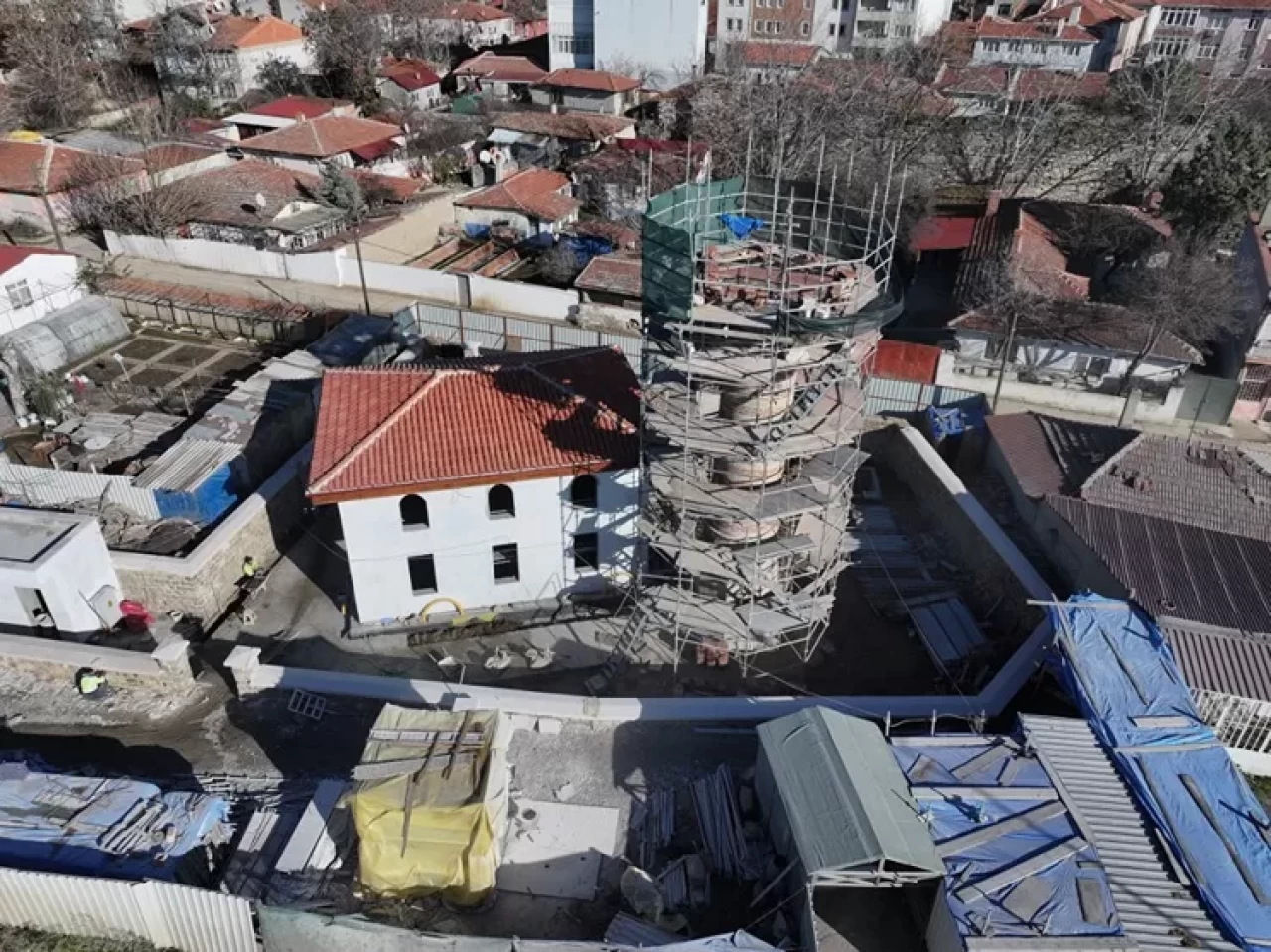 Kazı çalışmalarının ardından ekipler, çevre duvarlarının yapımına başlarken yarısı yıkık minarenin tamamlanması için iskele kurdu.