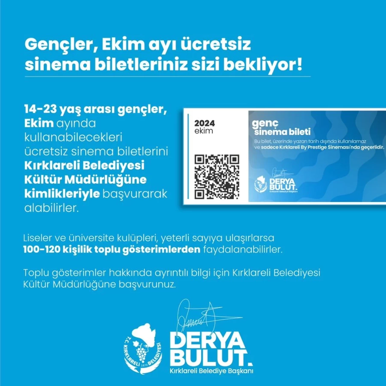 Kırklareli Belediye Başkanı Derya Bulut, sosyal medya hesabı üzerinden yaptığı açıklamada, gençlere yönelik ücretsiz sinema bileti kampanyasını duyurdu. 2024 yılı Ekim ayı boyunca, 14-23 yaş arası gençler, Kırklareli Belediyesi Kültür Müdürlüğü’ne kimlikleriyle başvurarak ücretsiz sinema biletlerini temin edebilecekler.