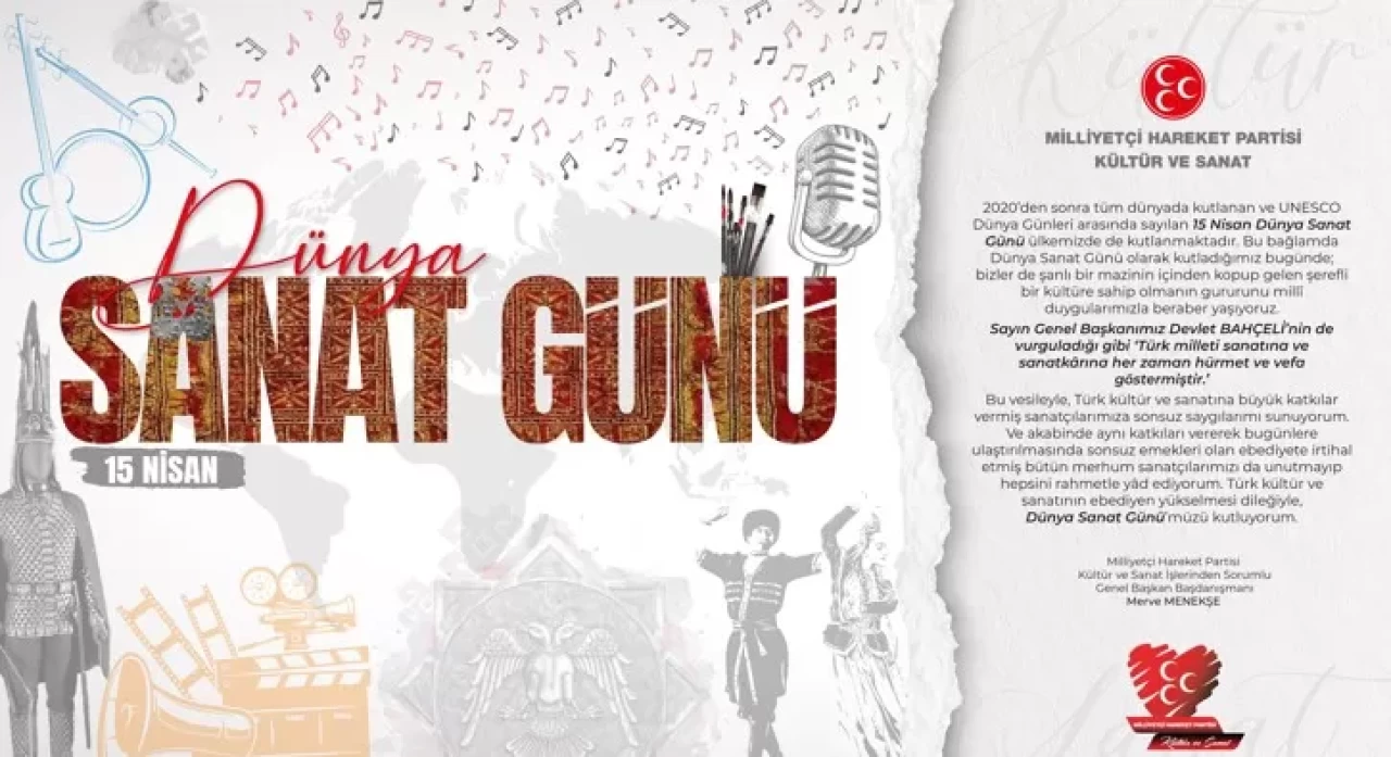 "2020’den sonra tüm dünyada kutlanan ve UNESCO Dünya Günleri arasında sayılan 15 Nisan Dünya Sanat Günü ülkemizde de kutlanmaktadır. Bu bağlamda Dünya Sanat Günü olarak kutladığımız bugünde; bizler de şanlı bir mazinin içinden kopup gelen şerefli bir kültüre sahip olmanın gururunu millî duygularımızla beraber yaşıyoruz. Sayın Genel Başkanımız Devlet BAHÇELİ’nin de vurguladığı gibi ‘Türk milleti sanatına ve sanatkârına her zaman hürmet ve vefa göstermiştir.’