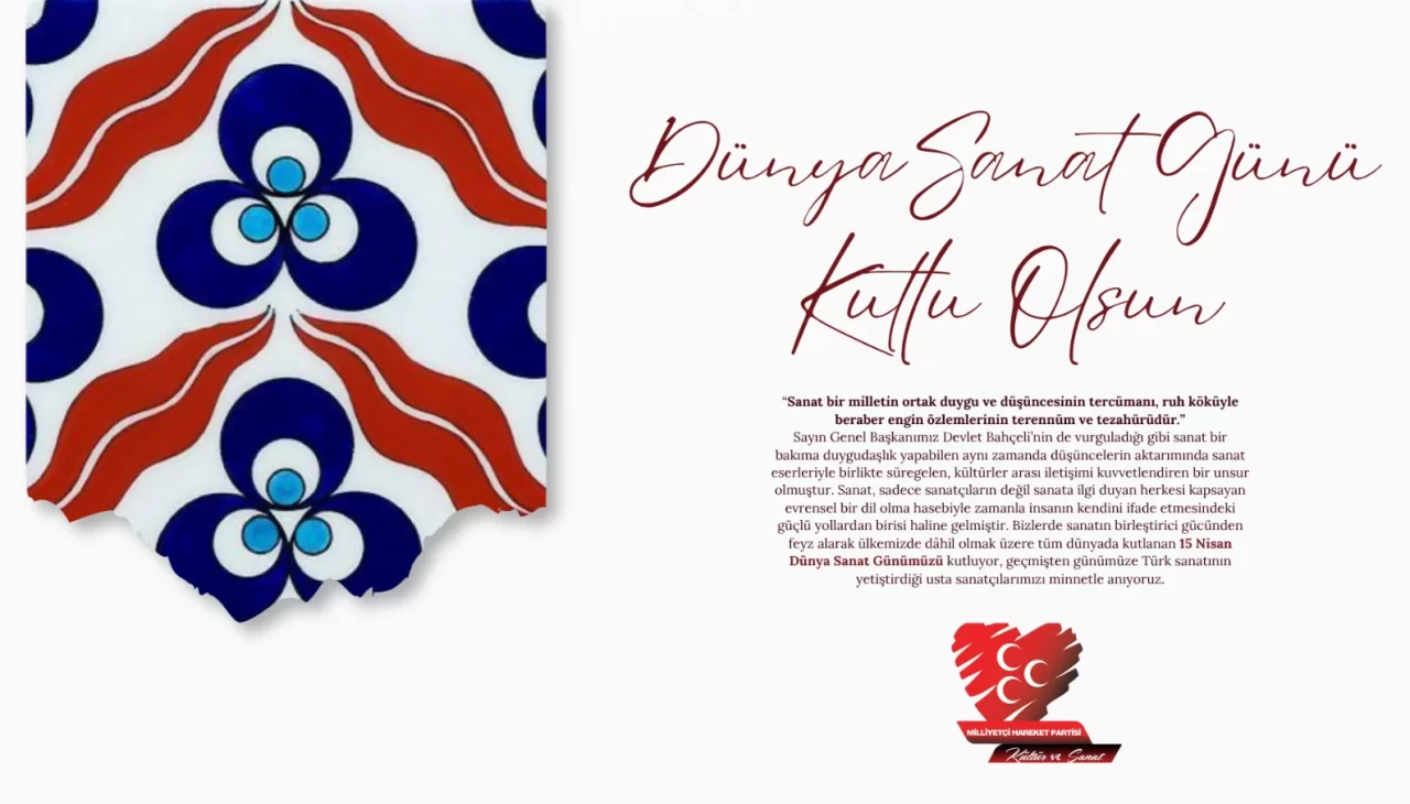 Milliyetçi Hareket Partisi (MHP), 15 Nisan Dünya Sanat Günü dolayısıyla yazılı bir açıklama yayımladı. Açıklamada, sanatın toplumların ortak duygu ve düşüncelerini yansıtan önemli bir unsur olduğu vurgulandı.