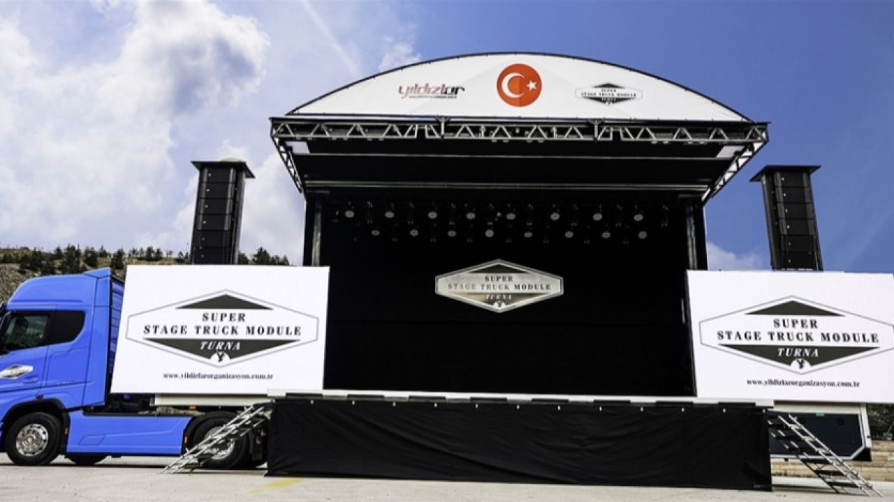Yerli organizasyon şirketinin akıllı sistemler ve son teknoloji ekipmanlarla donattığı "Süper Sahne Tır Modülü Turna", her türlü hava koşulunda 2 teknik personelle 15 dakikada sahne kurulumuna imkan veriyor.