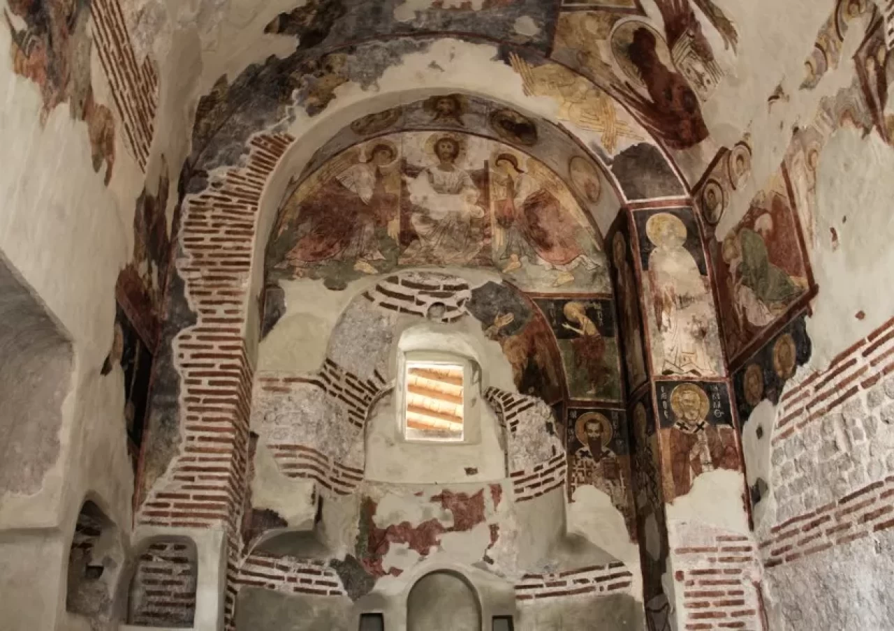 "Apsis dediğimiz mihrabın üst kısmında İsa, ilahi bir tahtta oturuyor. İki yanında Mikail ve Cebrail ile görüşüyor. Onun altında eli gözüken bir Meryem tasviri var. Meryem iki elini yana açmış insanlığı kucaklarken gösteriliyor. Duvarda üzerlerinde hac olan din adamlarını görüyoruz. Bunlar Hristiyanlığı kurumsal hale getiren, dini törenleri düzenleyen, dini yaşamı düzenleyen önemli din adamları. İkona dediğimiz taşınabilir resim gibi ince ayrıntılarla yapılmış. Yine tek aziz figürleri var, azizeler görüyoruz."