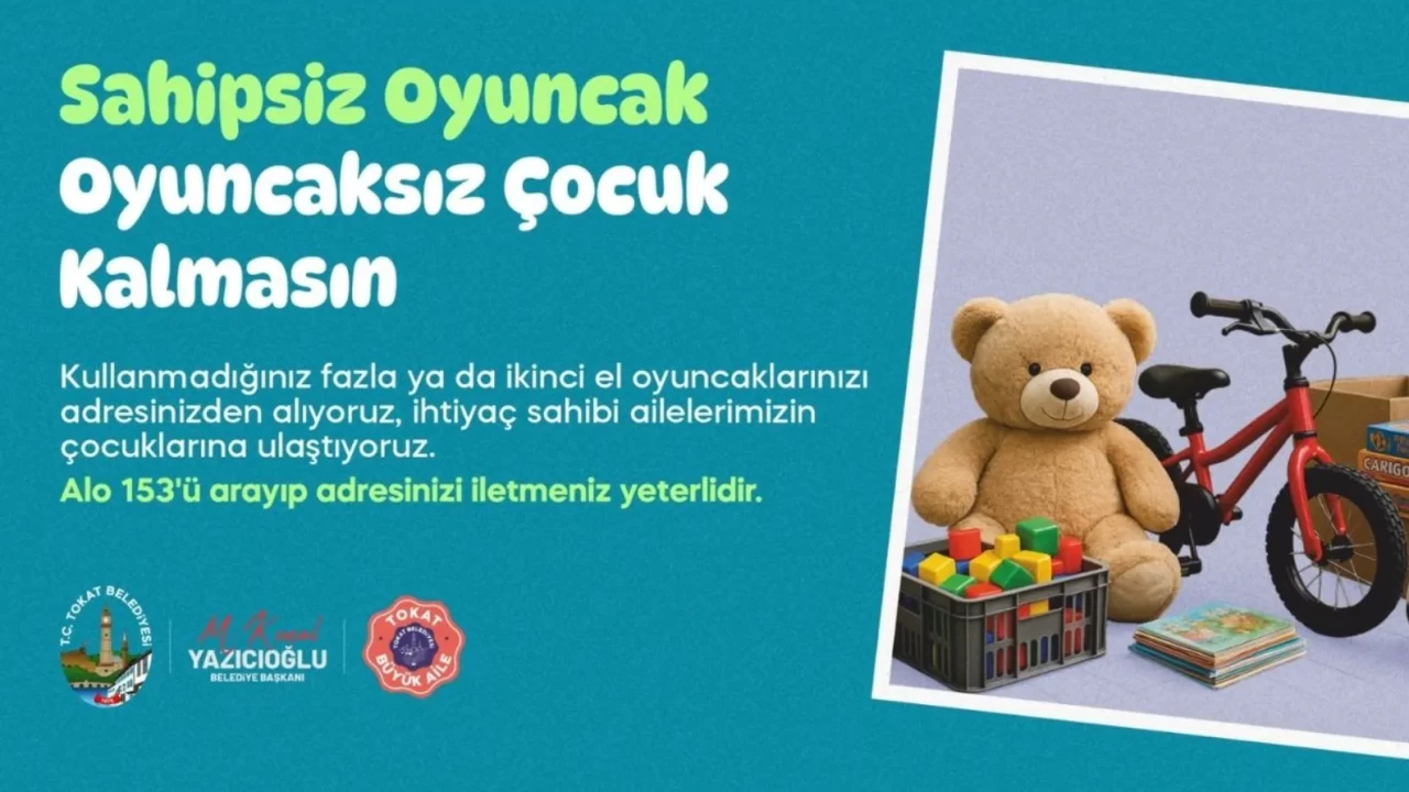 Tokat Belediyesi, çocukların yüzünde tebessüm, kalplerinde umut olmak amacıyla “Sahipsiz Oyuncak, Oyuncaksız Çocuk Kalmasın” kampanyasını başlattı. Kampanya kapsamında vatandaşların kullanmadıkları fazla ya da ikinci el oyuncaklar, belediye ekipleri tarafından adreslerinden alınarak ihtiyaç sahibi ailelerin çocuklarına ulaştırılacak.