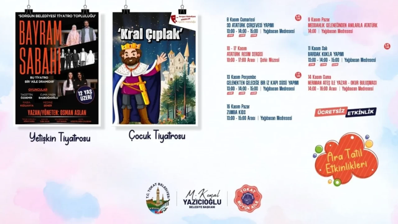 “Çocuklarımızın ve gençlerimizin hem eğlenip hem öğrenebileceği, aynı zamanda kültürel değerlerimizle buluşacağı bir tatil dönemi için etkinliklerimizi hazırladık. Tokat Belediyesi olarak eğitime, sanata ve kültüre destek vermeye devam ediyoruz. “Tokat Büyük Aile” vizyonumuz doğrultusunda hazırladığımız bu etkinliklerde ailelerimizin çocuklarıyla birlikte verimli ve keyifli bir ara tatil geçirmesini diliyorum.”