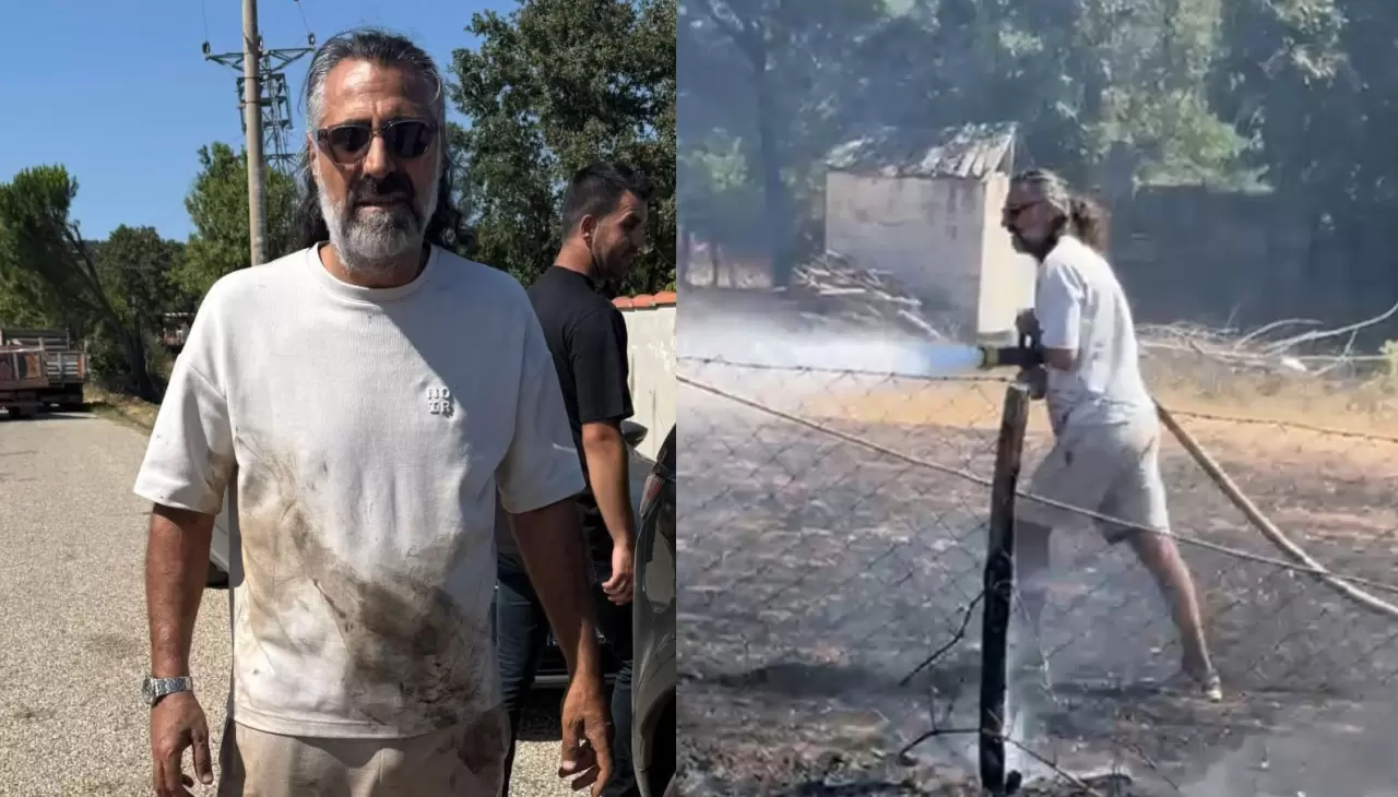 Çanakkale'de bir evin bahçesinde çıkan yangını söndürme çalışmalarına ünlü oyuncu Kenan Çoban da destek verdi.